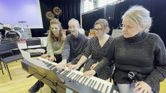 Demonstrasjon av enkelttimene og hvordan disse fungerer som målrettede forberedelser til Musikkfatet. Lærerne deltar aktivt i elevrollen.